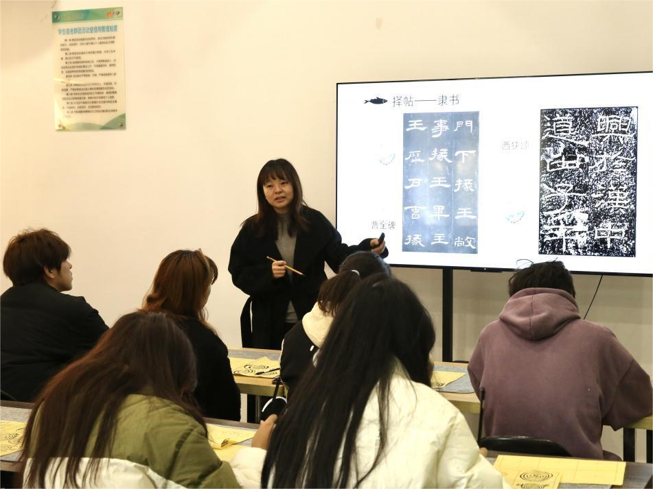 活动现场,指导老师刘苏青从执笔姿势、运笔技巧等基础内容入手,细致讲解汉字书写从实用到审美的演变历程,深入浅出地阐释了笔墨间“刚柔相济”“虚实相生”的东方哲学。同学们兴致盎然,在老师的指导下凝神聚力、挥毫泼墨,或临摹经典碑帖,或自由创作,一笔一划间尽显对书法艺术的热忱。